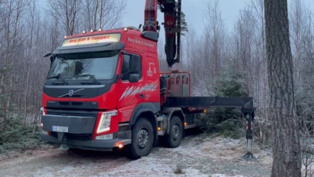 Transportbilen rygger inn. Trafikken måtte stoppes i flere minutter. Båtshaka til Per Frode kom godt med for å få på plass stroppene.