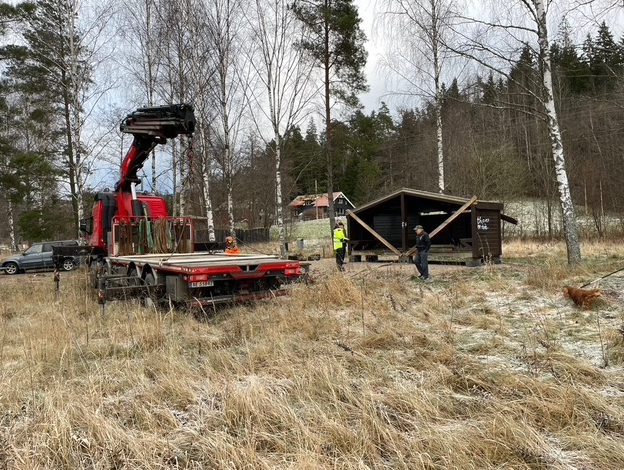 Omsider var dagen kommet da gapahuken vi hadde kjøpt kunne flyttes fra Moenskogen til Eidet. Vi hadde ventet på klarsignal både fra kommunen og fra transportfirmaet som skulle flytte den. Klokken 8 på morgen var 4 medlemmer fra klubben (Per Frode, Per Inge, Kai og Dag) samt transportbilen med mannskap på plass. Litt fjerning av noen grener måtte gjøres og etter det gikk det ganske greit å få heist opp gapahuken og plassert den på bilen. Kommunen hadde gjort klar «tomten» der den skulle plassers ved å fylle opp med grus, planert dette og lagt ut Leca-blokker. Også her måtte noen kvister fjernes før gapahuken kunne heises på plass, men etter det var gjort gikk dette greit.