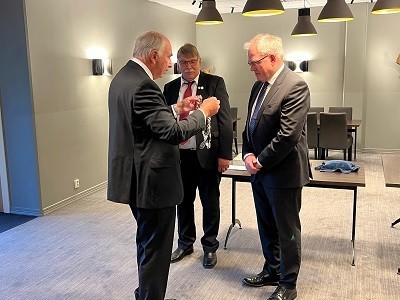 Bildet viser Ceremonimester Terje Westby (til venstre) når han tar presidentkjedet av avtroppende president Dag-Fredrik Reymert (til høyre) og setter det på påtroppende president Dag Gipling.
